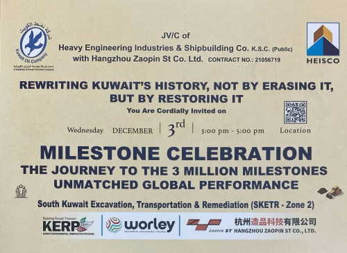 On December 3rd, the "3 Million Tonnage Milestone" celebration of the South Kuwait Excavation, Transportation & Remediation Project (SKETR - Zone 2) was held in Kuwait. The KOC, HEISCO senior management and the project team from Hangzhou Zaopin ST gathered at the scene to jointly witness this landmark moment in environmental governance co-created by Hangzhou Zaopin ST and HEISCO (Heavy Engineering Industries & Shipbuilding Co. K.S.C.). During the celebration, Kuwait government presented an award to Mr. Dai Baiping, CEO of Hangzhou Zaopin ST, in recognition of the company's outstanding performance in the Kuwait soil remediation project.